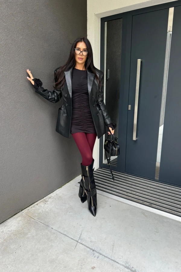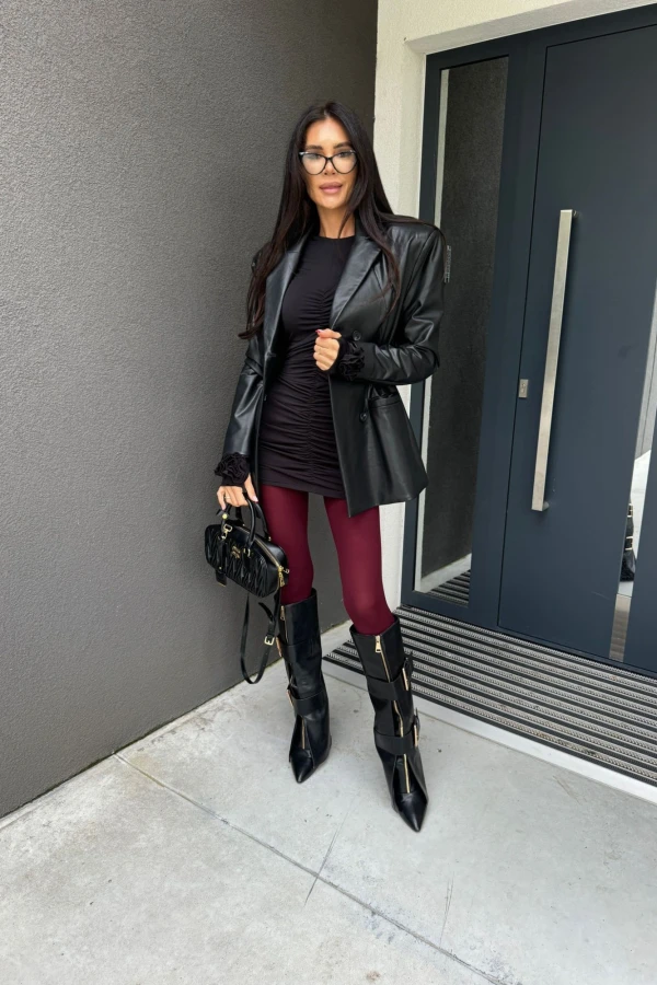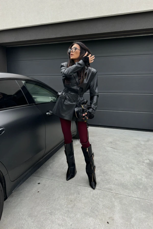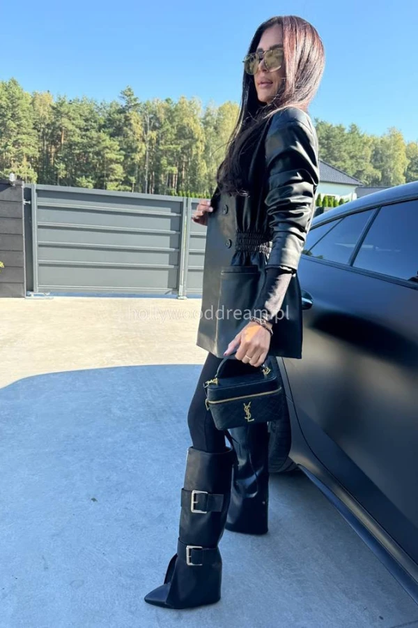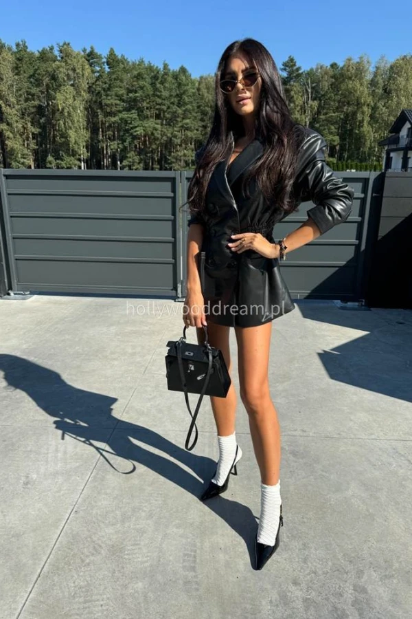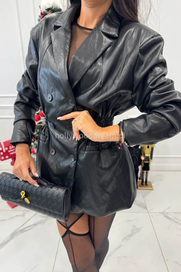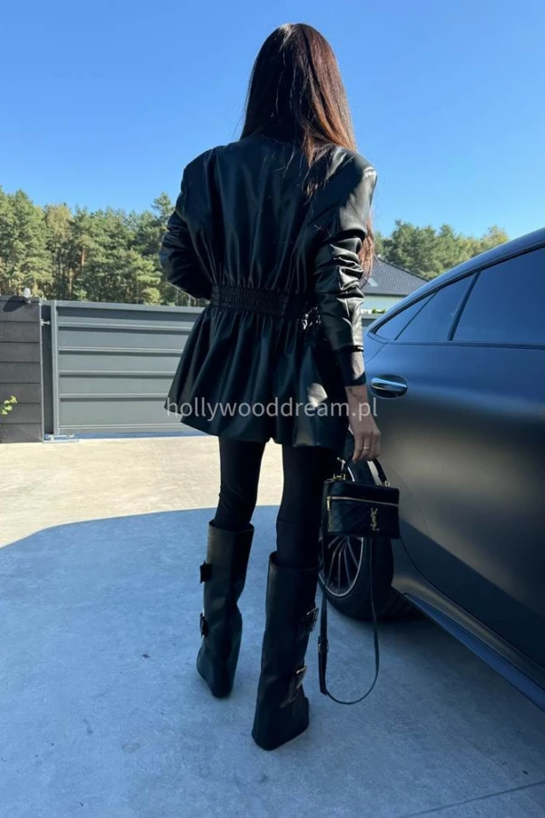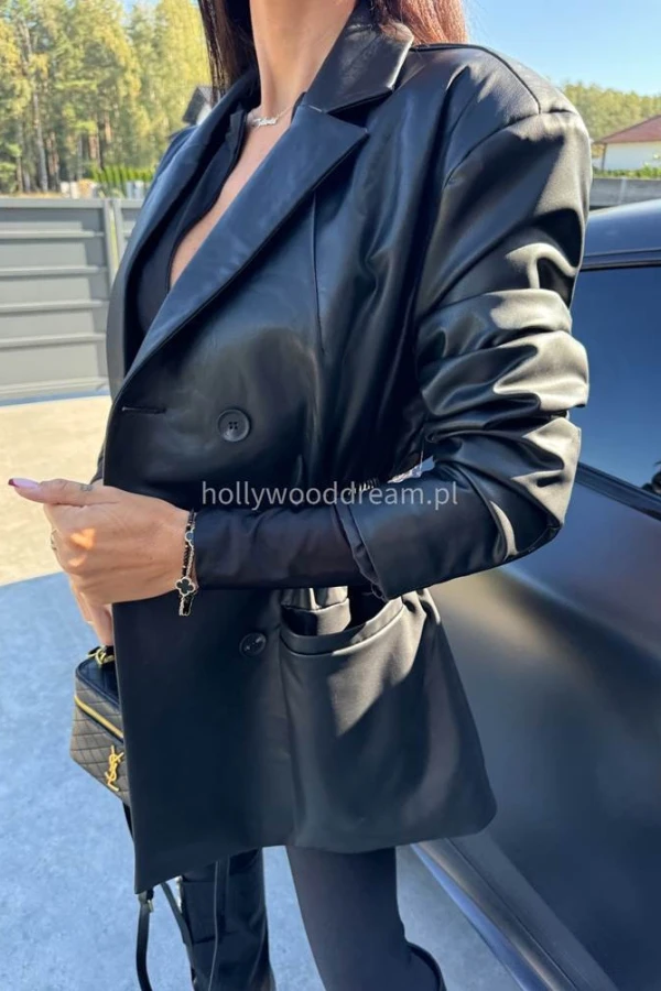 Czarna marynarka dłuższa z eko skóry gniecionej WALENTINA 171