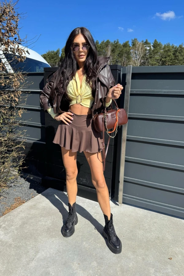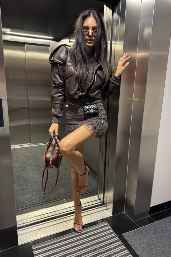 Podkreśl swoją stylizację modową dzięki kurtce bomberce LINSEY w eleganckim głębokim czekoladowym odcieniu. Wykonana z wysokiej jakości eko-skóry, zapewnia nowoczesny wygląd i wygodę noszenia. Uniwersalny fason bomberki z klasycznym zapięciem na napy oraz ściągaczami u dołu i na rękawach świetnie dopasowuje się do sylwetki. Kurtka idealnie sprawdzi się na chłodniejsze dni, nadając charakteru zarówno casualowym stylizacjom z jeansami, jak i bardziej eleganckim zestawieniom ze spódnicą czy sukienką. Postaw na styl i wygodę z LINSEY!