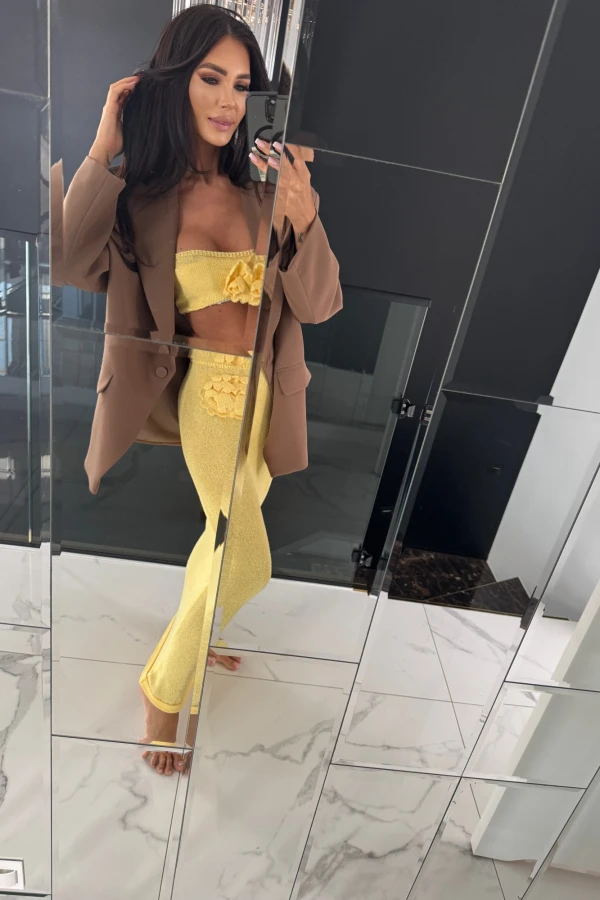 Oczaruj wszystkich swoim wyglądem w naszym eleganckim dzianinowym komplecie Sia, stworzonym w naszym butiku! Ten wyjątkowy komplet w odcieniu żółtym to połączenie dziewczęcego uroku i nowoczesnej formy. Dziergany top ozdobiony jest romantyczną różą, a dopasowana spódnica maxi z dopasowaną różą tworzy z nim idealny duet. Stylowy, wygodny i pełen subtelnego wdzięku — świetny wybór na wyjątkowe okazje i letnie dni.