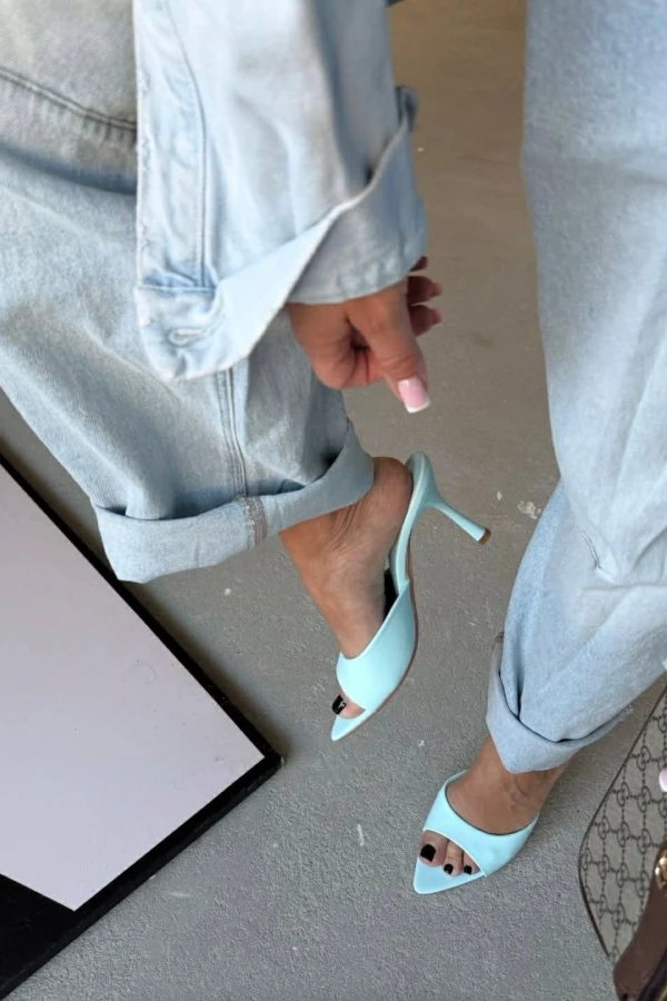 Błękitne klapki na obcasie Reya to elegancki model ze szpiczastym czubkiem, który optycznie wysmukla stopę. Obcas o zwężającym się kształcie – od góry ku dołowi – nadaje całości nowoczesnego i kobiecego charakteru. Klapki doskonale sprawdzą się w eleganckich i wieczorowych stylizacjach.
