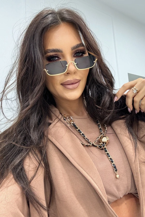 Czarno-złote okulary przeciwsłoneczne Kennedy z półramką to elegancki model o nowoczesnym, geometrycznym kształcie. Złota oprawka na zausznikach i elementy w czarno-złotym odcieniu dodają im wyrazistego charakteru. Czarne szkła zapewniają komfort noszenia, a subtelna półramka podkreśla stylowy, efektowny design. Idealne jako modny dodatek do codziennych i eleganckich stylizacji.