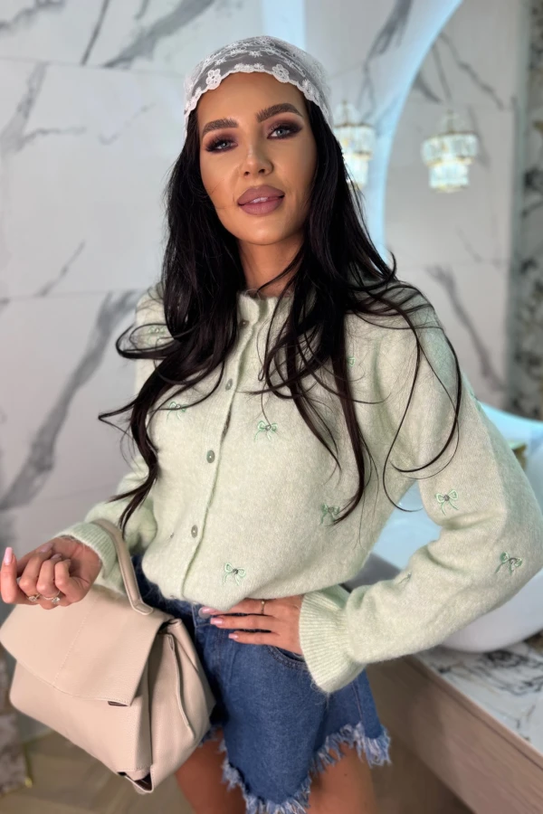 Sweter Elvira w kolorze pistacjowym to kobiecy model z ozdobnymi detalami. Jest rozpinany na guziki i zdobiony motywem kokardek, na których znajdują się cyrkonie. Przy dekolcie oraz na rękawkach ma falbankę. Dobrze wygląda w stylizacjach z jeansami, spódnicą lub elegantszymi spodniami.