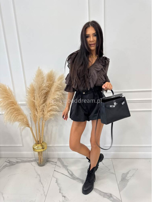 Spodenki krótkie bombka JULIETTA czarne to modna alternatywa dla klasycznych szortów. Ich delikatnie zaokrąglony, lekko bufiasty krój pięknie modeluje sylwetkę i nadaje stylizacji kobiecego, nowoczesnego charakteru.Wykonane z lekkiego, komfortowego materiału, idealnie sprawdzą się w cieplejsze dni. Czarny kolor to ponadczasowa baza, którą łatwo zestawisz zarówno z elegancką bluzką, jak i sportowym T-shirtem. Elastyczna talia zapewnia wygodę i świetne dopasowanie.
