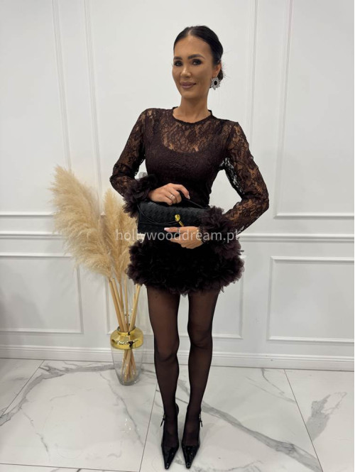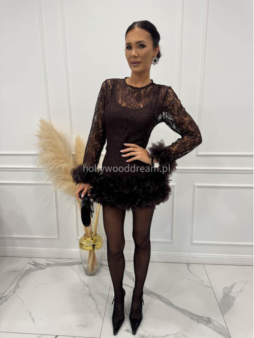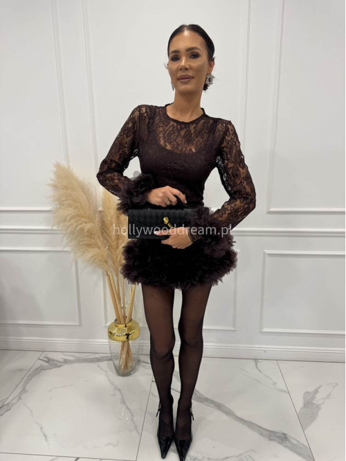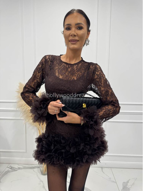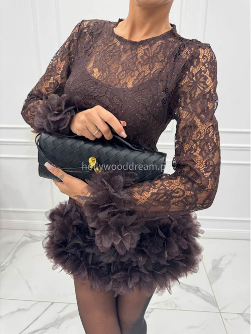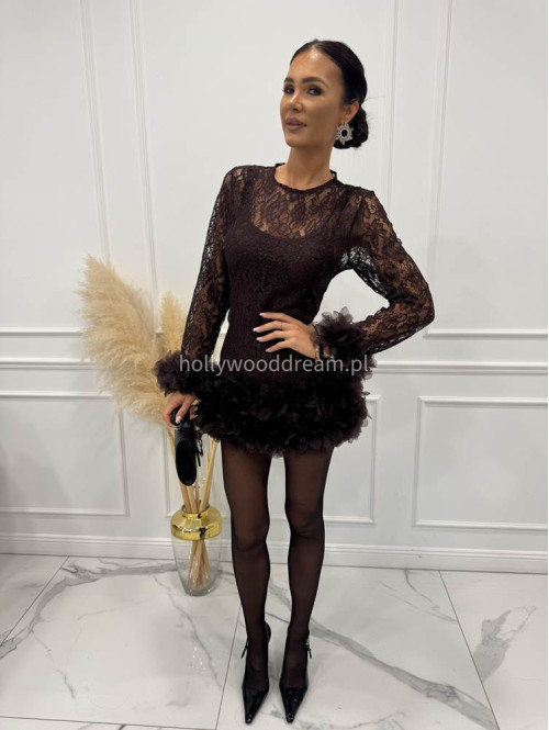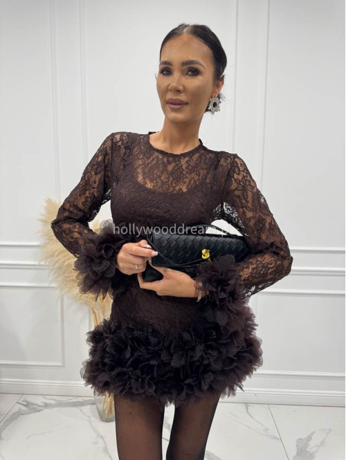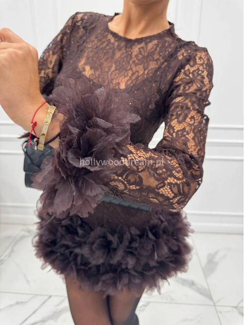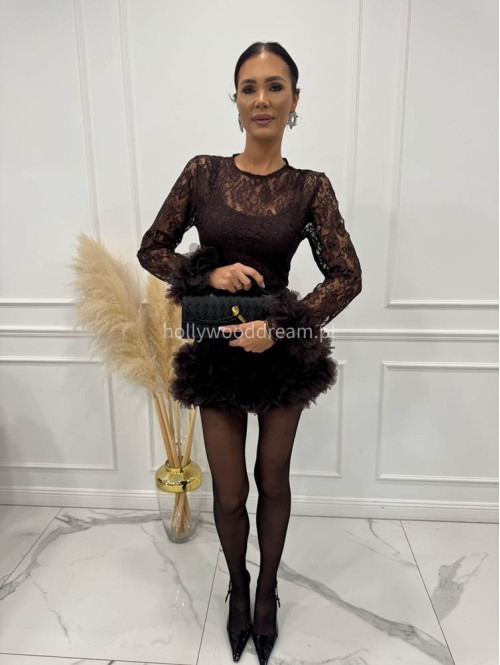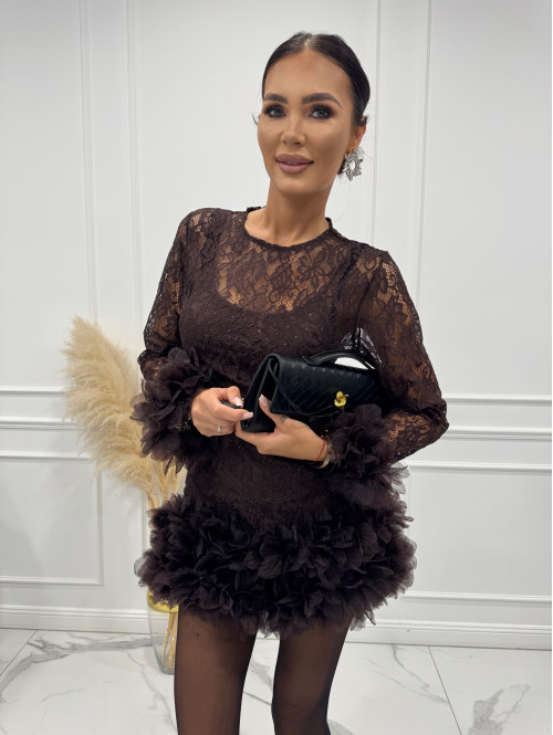 Czekoladowa sukienka koronkowa wykończona tiulem Alesha 09