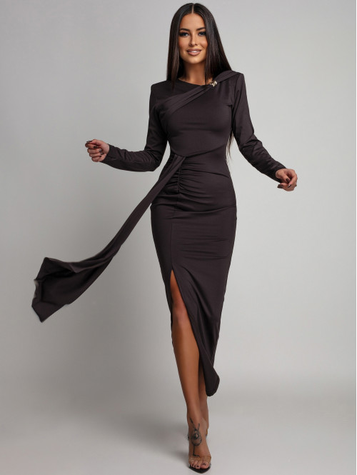 - Czekoladowa sukienka maxi z rozporkiem i szarfą oraz ozdobą na dekolcie Lidka 26