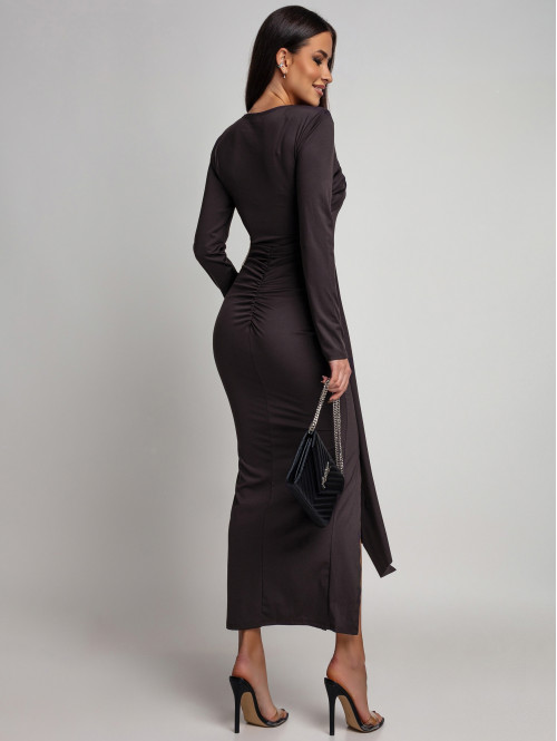 Czekoladowa sukienka maxi z rozporkiem i szarfą oraz ozdobą na dekolcie Lidka 26